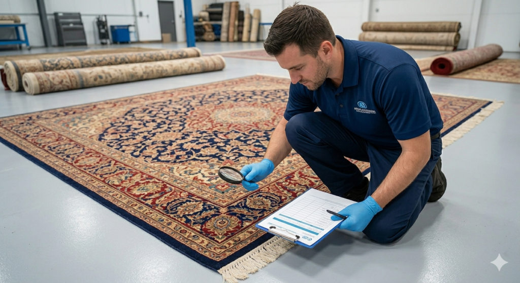 We start by identifying the rug material, condition, and any areas that need special attention. - Pre-Treatment Application